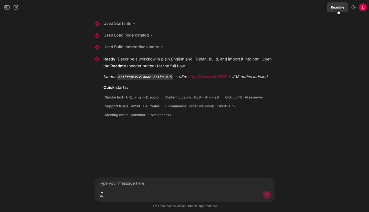 A Chainlit-based chat UI where you describe your workflow ('when a new lead lands in Typeform, send a Slack message and log to Notion'), the AI produces real n8n JSON with the right nodes, credential slots, and test data. Import-ready. Trained on many templates with fastembed vector search to find the closest-matching pattern.